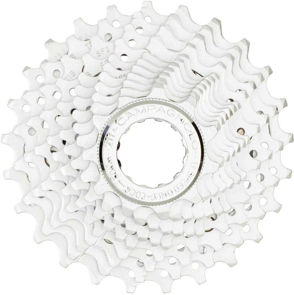 Die 11-fach Ritzelpakete basieren auf einem Triplett und 8 einzelnen Ritzeln mit Distanzhülsen aus Aluminium und sind mit der restlichen Campagnolo Produktpalette (mit Ausnahme der 11-32; erfordert mittellanges Schaltwerk) kompatibel.