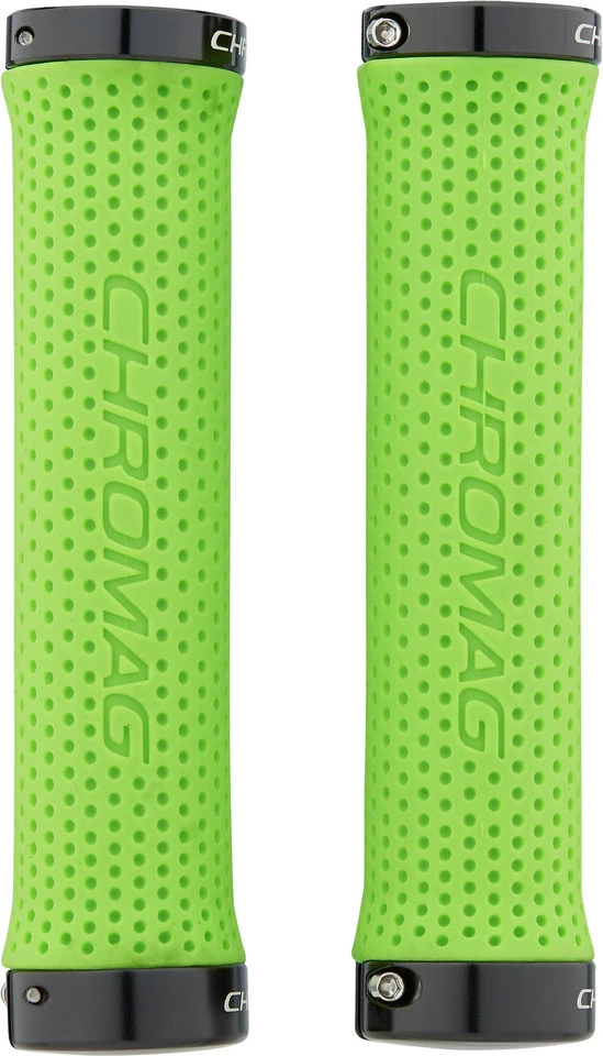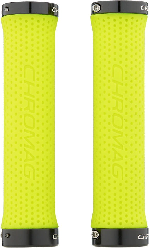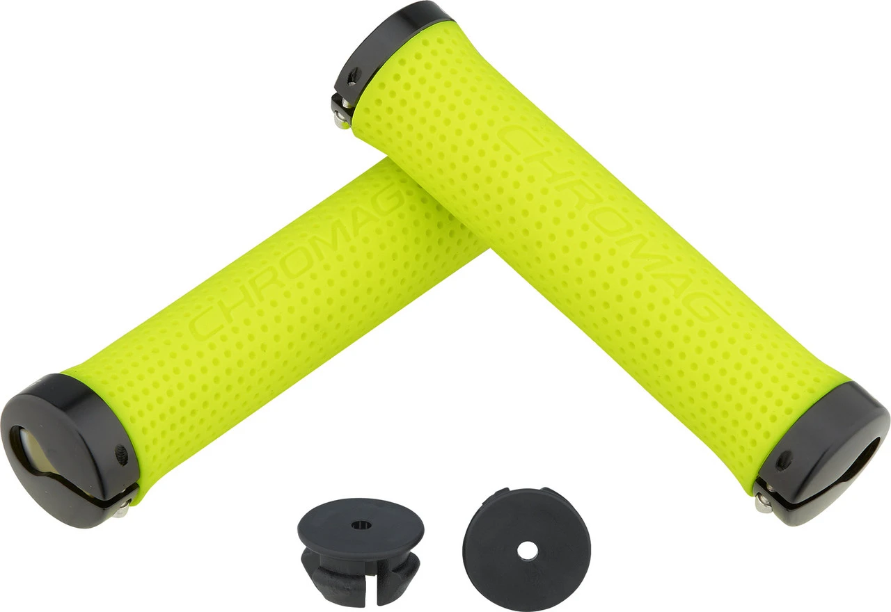 Farbgebung: grüngelb mit schwarzen LockringenHerstellernummer: 170-003-27Lieferumfang:1 Paar Lenkergriffe Chromag Basisinkl. Lockringeinkl. Schrauben