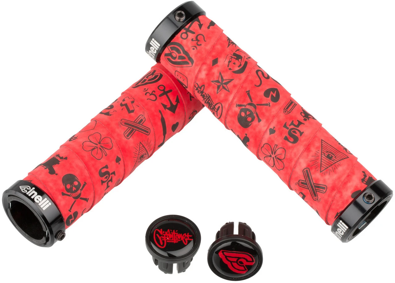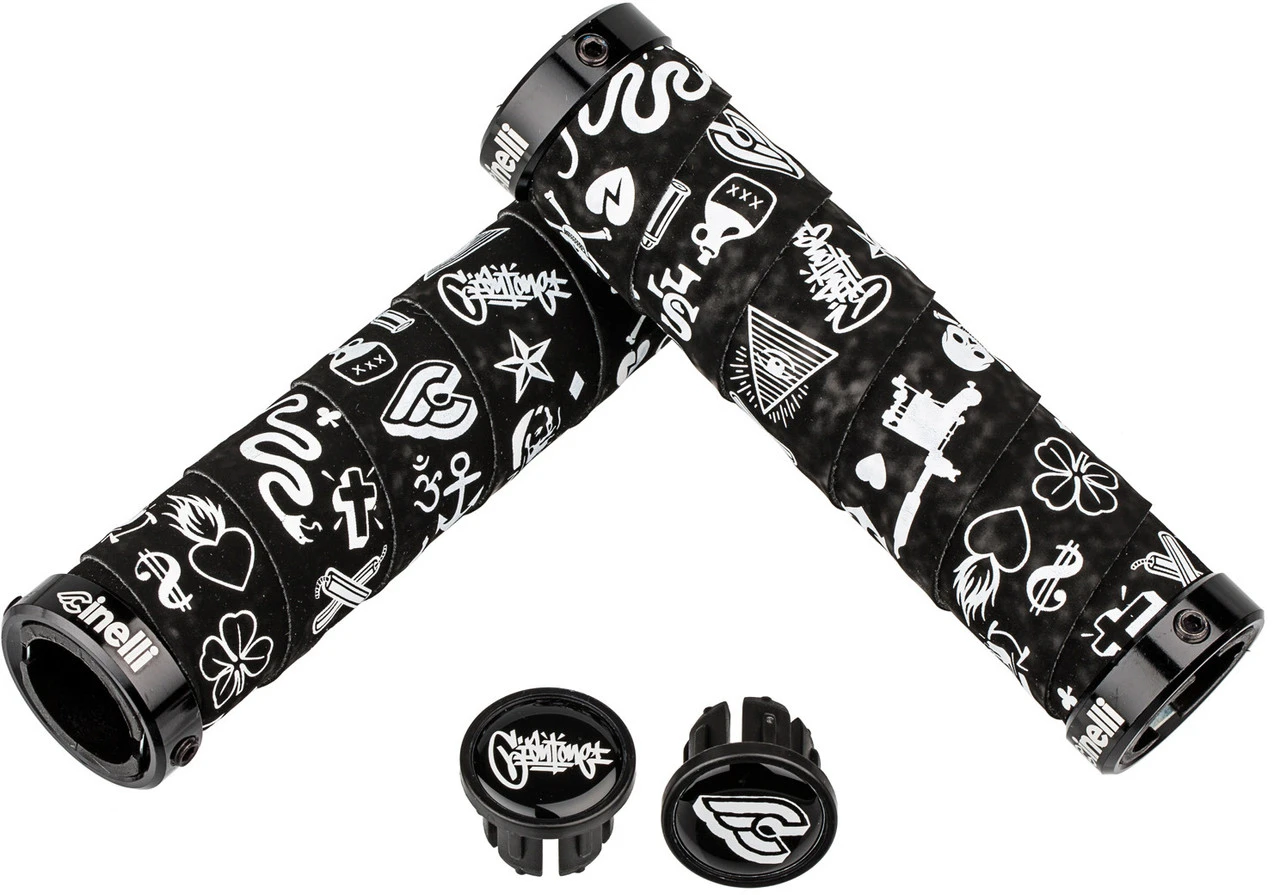 Das Grafik-Tattoo des kalifornischen Künstlers Mike Giant und die sensationelle Weichheit von Samt vereinen sich in diesen Multidichte-Griffen. Inklusive Lockringe aus eloxiertem Aluminium mit Cinelli Schriftzug.