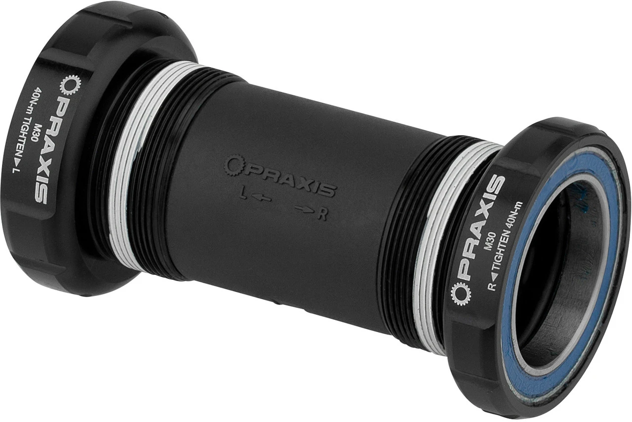 Praxis Works M30 Innenlager sind ausschließlich zur Verwendung mit Praxis Works M30 Kurbeln geeignet. Die M30 Achse entspricht einer Art „Oversize GXP“. Sie ist 30 mm dick und am linken Ende auf 28 mm reduziert, um auf das nicht-antriebsseitige Lager zu passen. Zum Einsatz kommen eine wellenförmige Unterlegscheibe auf der Antriebsseite zur Vorspannung sowie ein 30 mm Lager, dem auf der Nichtantriebsseite ein 28 mm Lager gegenübersteht. M30 kombiniert die Vorteile breiter Lager mit den Vorteilen einer stämmigen 30 mm Achse. Dies ermöglicht einen sicheren Sitz und bessere Kraftübertragung.